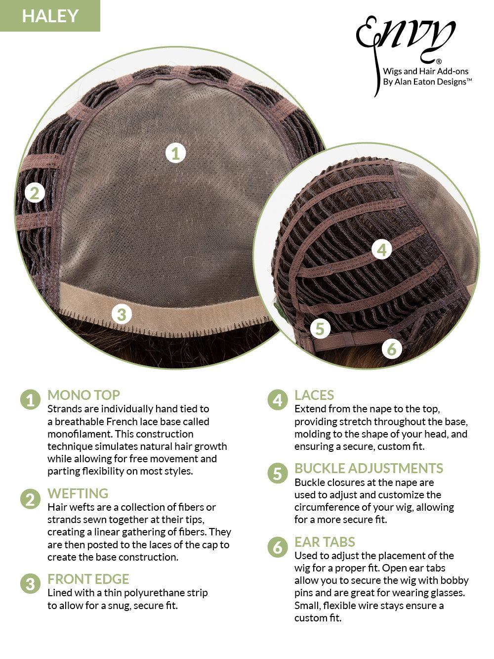 HALEY’s strategically placed layers create movement and ease of styling—just shake them out, comb in place, and go! The lightweight Mono Top construction gives the appearance of your natural scalp, while 100% Kanekalon® fibers ensure it will hold its shade, shine, and shape.
