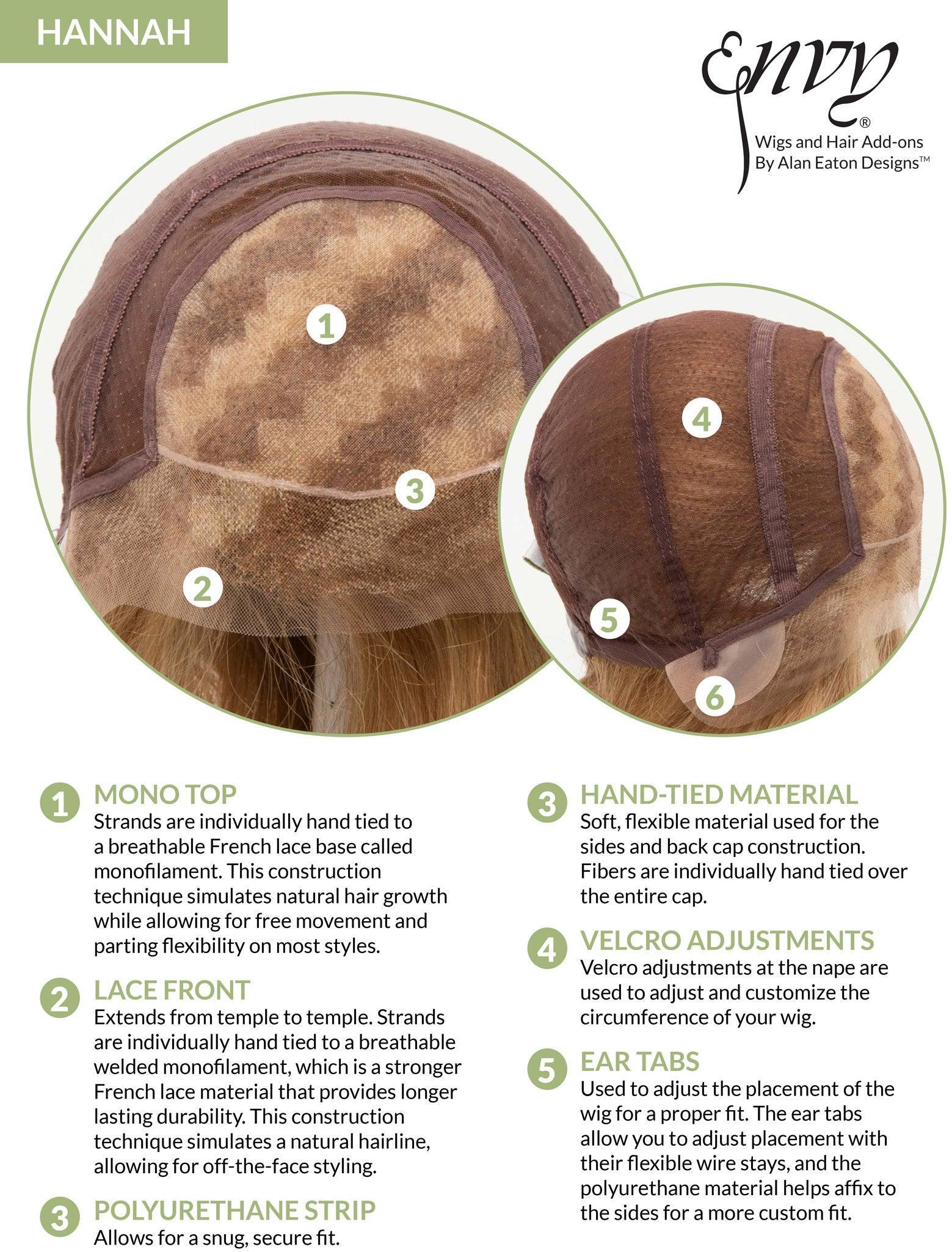 Made of Fully of Human Hair and available in 9 vibrant multi-dimensional shades, HANNAH by ENVY is an asymmetrical bob with heavy front fringe and sleek, side-swept bangs. With its Hand-Tied, Mono Top Lace Front construction providing the most authentic hairline and movement, plus built-in poly tabs for a custom fit, HANNAH takes beauty and confidence to the next level.