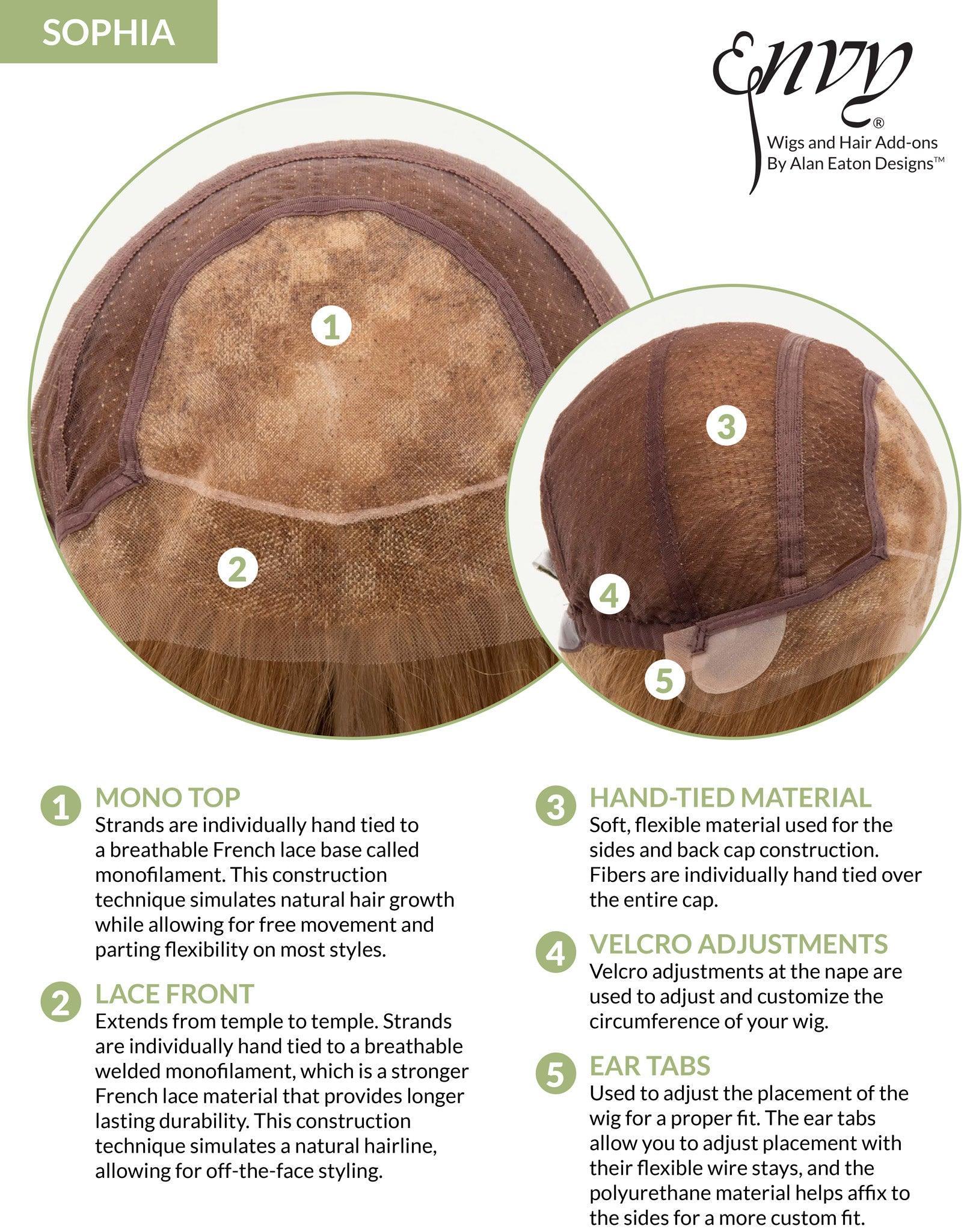 Easily customized by your favorite stylist, SOPHIA can be worn with layers, bangs or left as is in a stylish blunt cut . Every expertly selected strand is Hand-Tied to our Mono Top Lace Front cap for the most natural movement and hairline. While Adjustable Tabs at the nape and ears offer built-in customization for a perfect fit.