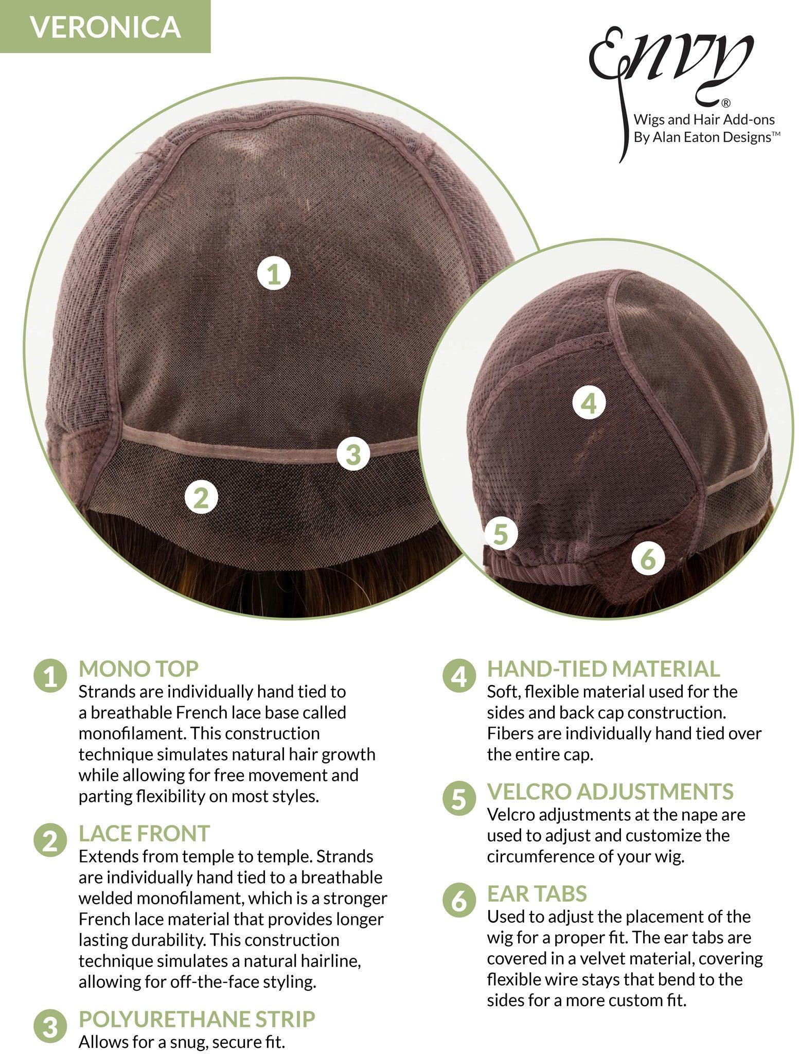 Looking for the drama and stylability of a longer wig? VERONICA features our exclusive EnvyHair™ heat-friendly blend which offers the versatility of human hair products—but at a fraction of the price. And its Mono Top construction and Hand-Tied sides and back provide an authenticity and stylability that is truly enviable.
